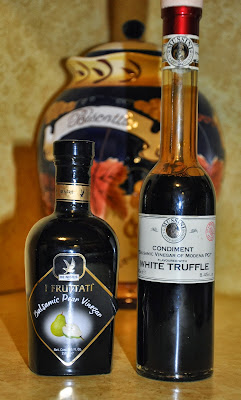 One of my favorite stores is Oil and Vinegar. They have an amazing selection of, you guessed it, oils and vinegars, along with spices and specialty items. The fun thing about this store is that you can taste things before you buy them. That's also kind of scary, because everything is so amazingly good! We selected two vinegars - a pear balsamic and a white truffle balsamic - and managed to get out of the store for less than $50... just. As we left with our treasured bottles, I was already trying to think up some creative recipe ideas.